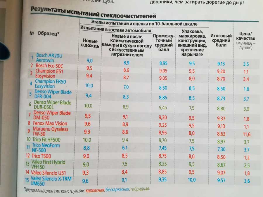 Таблица результата теста стеклоочистителей "За Рулем"